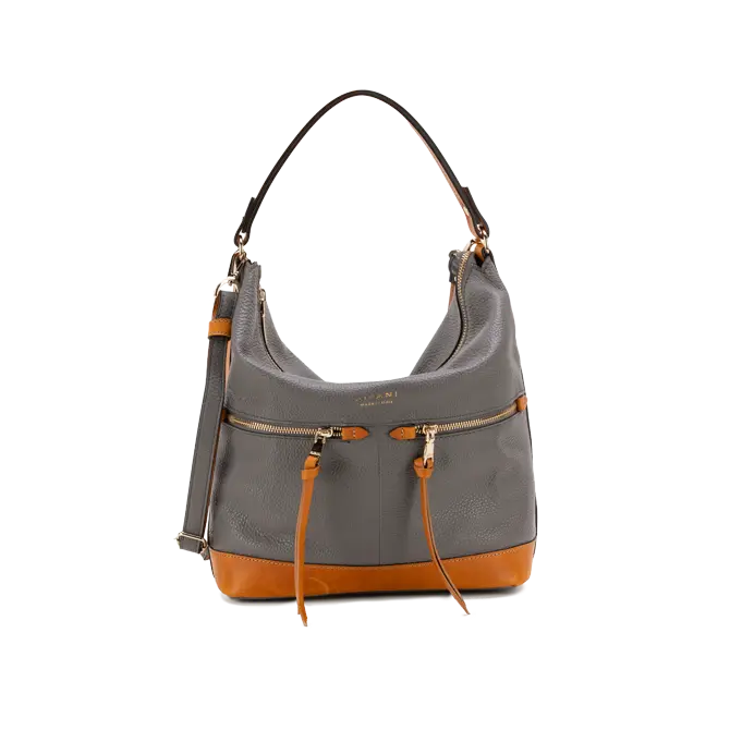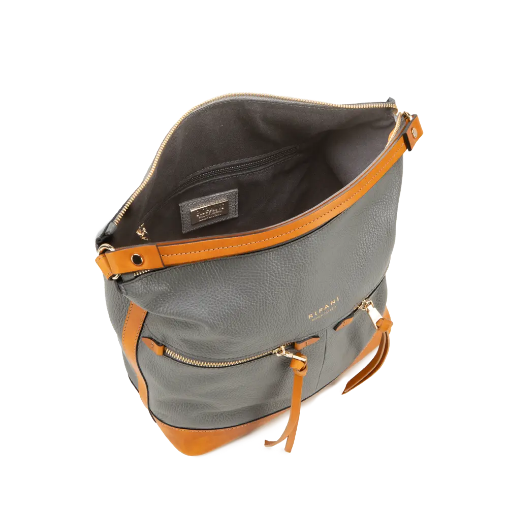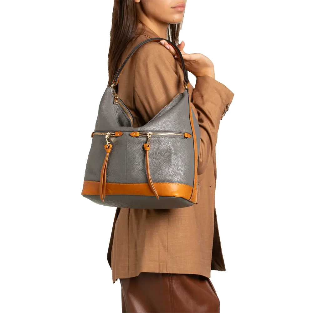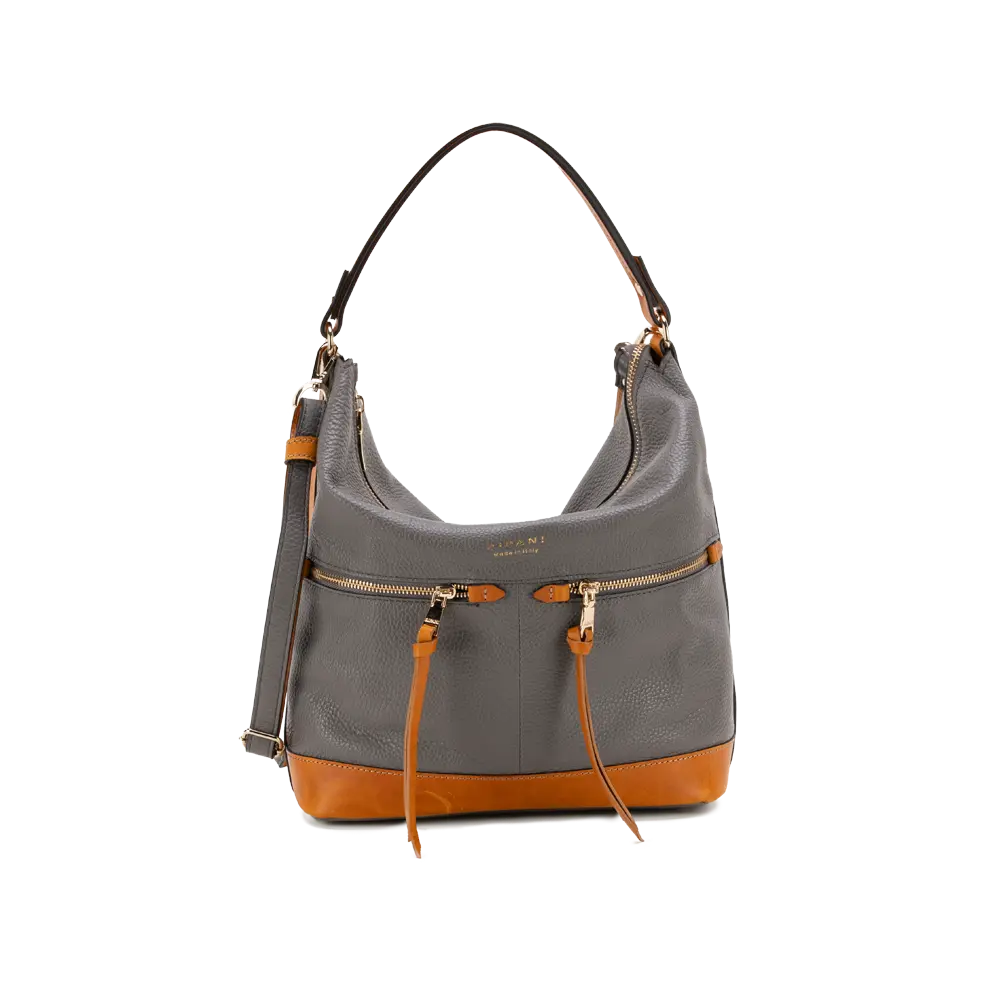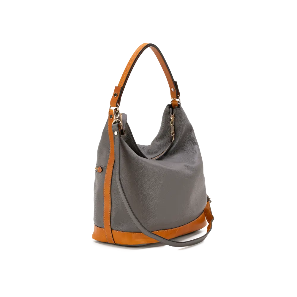 Soft, practical shoulder bag with contrasting details, provided with additional strap.
