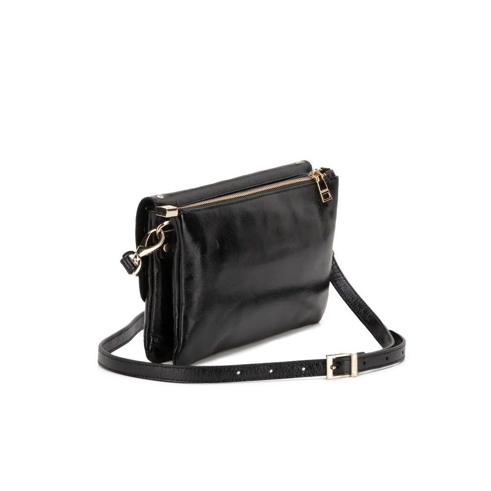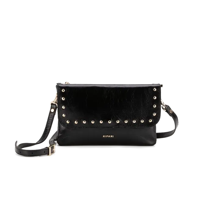 Shoulder strap with studded flap, metal handle and additional leather strap.