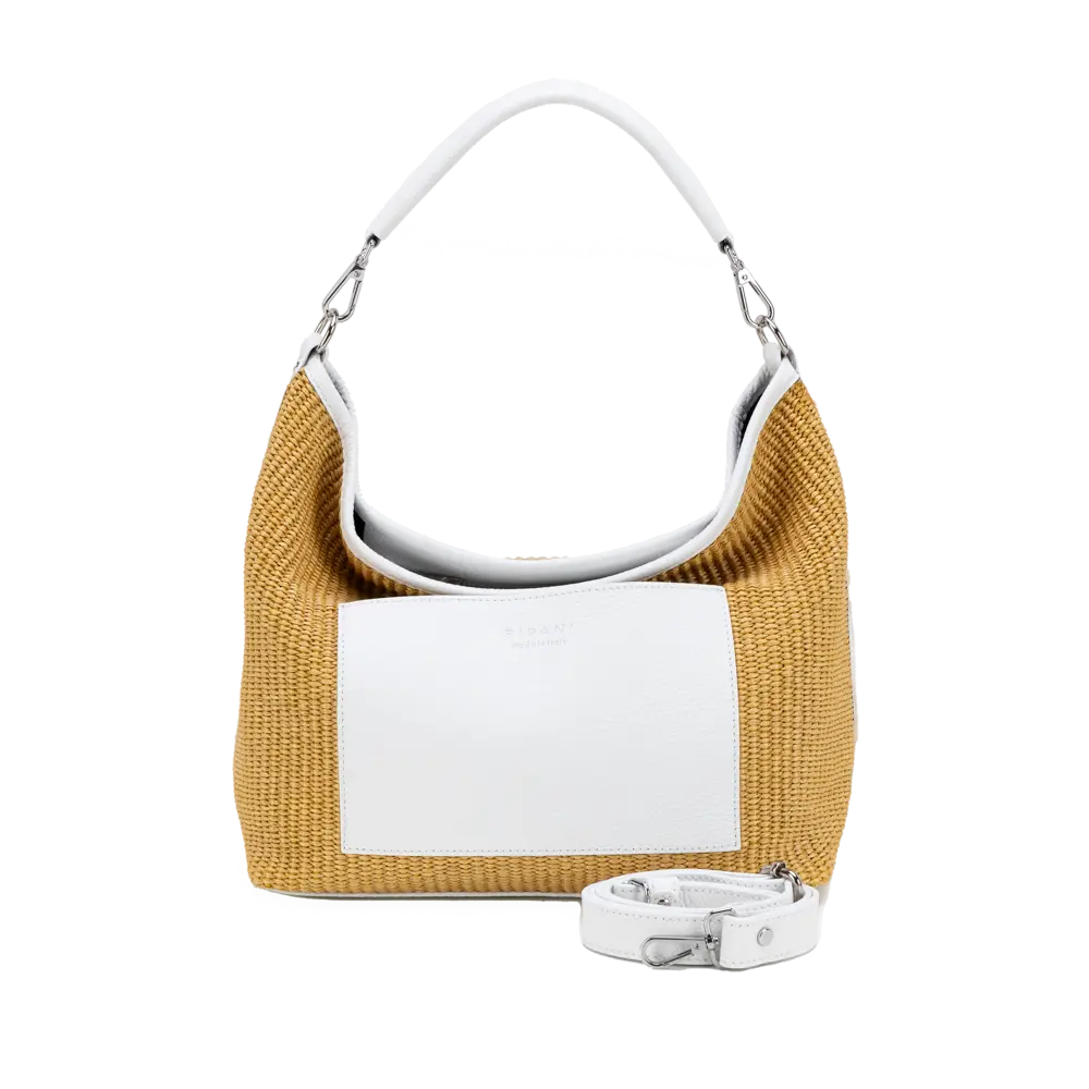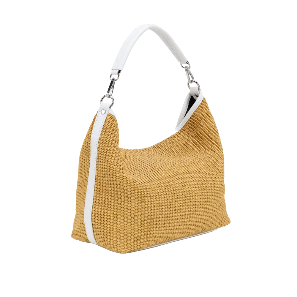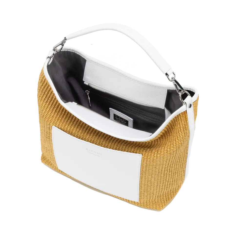 Raffia with Genuine deer-effect leather trim, Nickel accessories