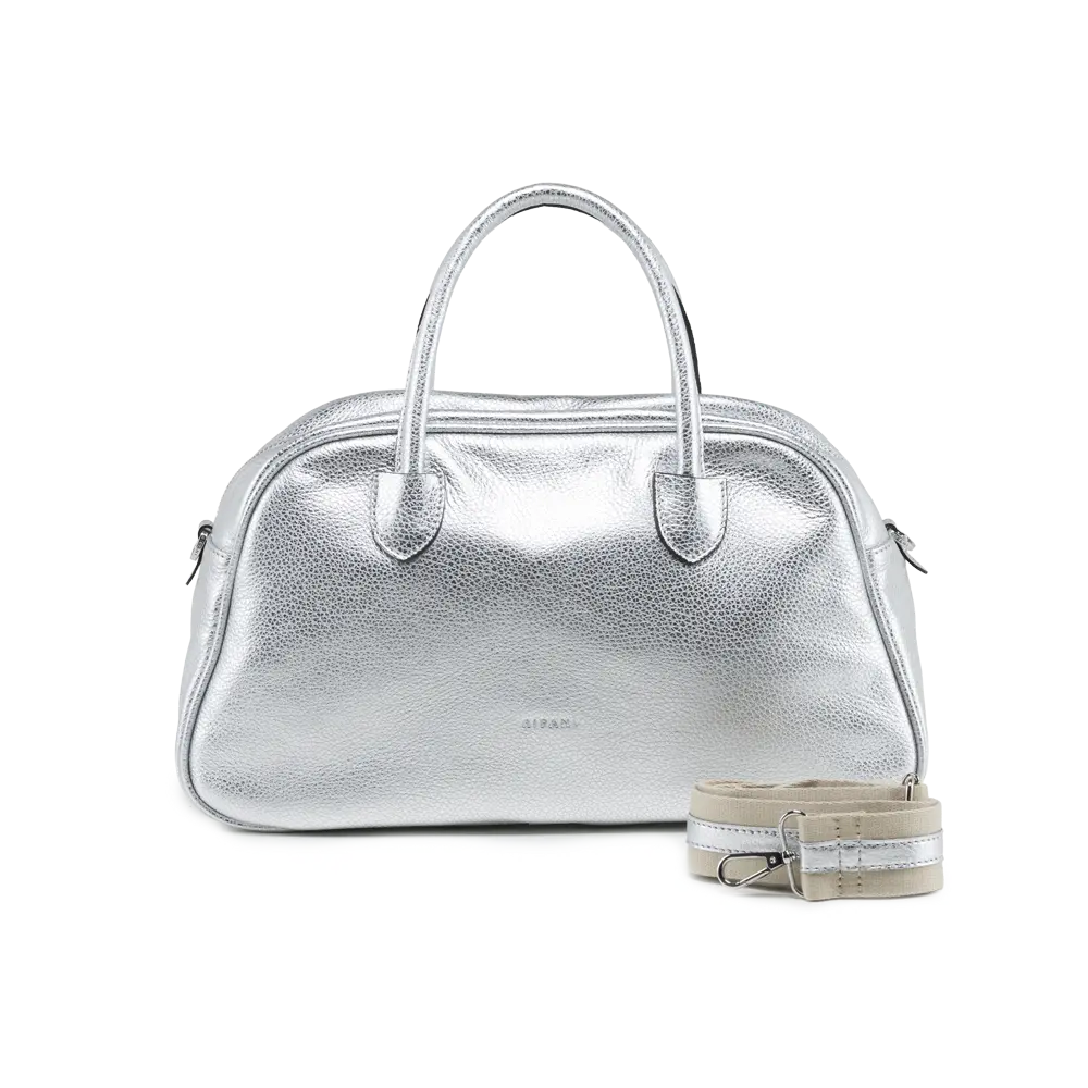 Zip closure, additional adjustable shoulder strap in ribbon and leather, internal pocket with zip, internal mobile phone holder