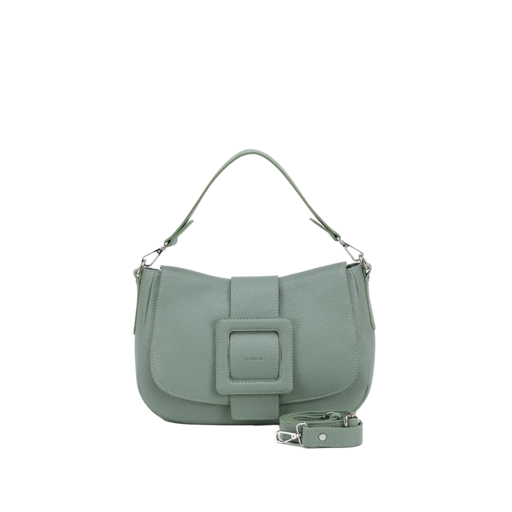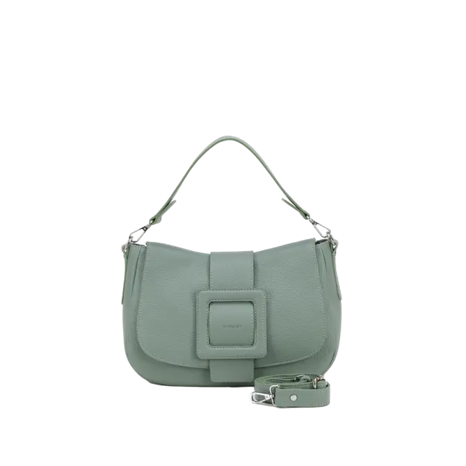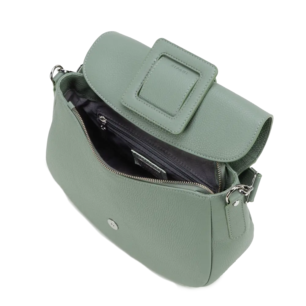 Front flap, magnet and zip closure, handmade buckle, additional adjustable shoulder strap
