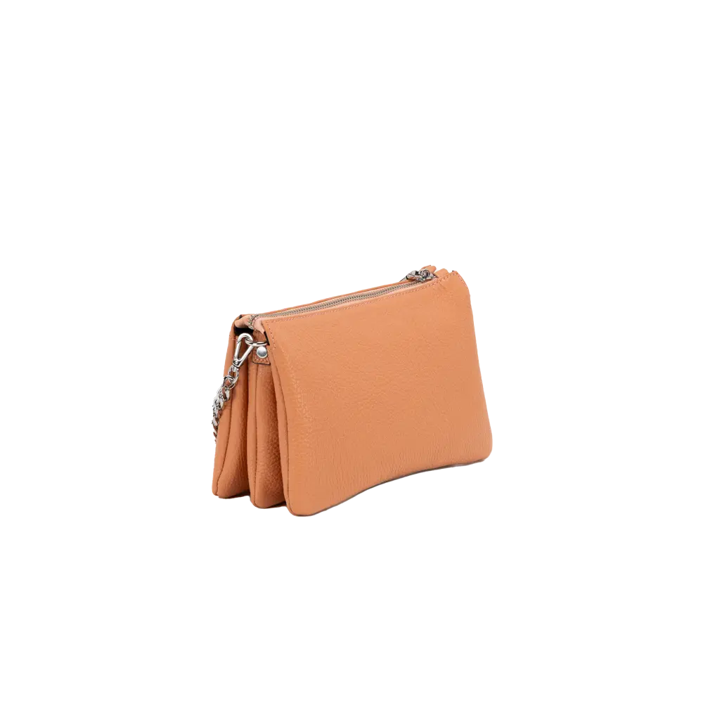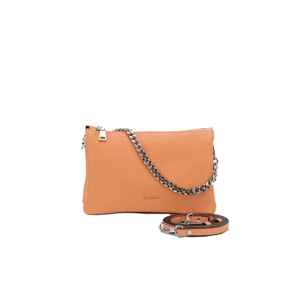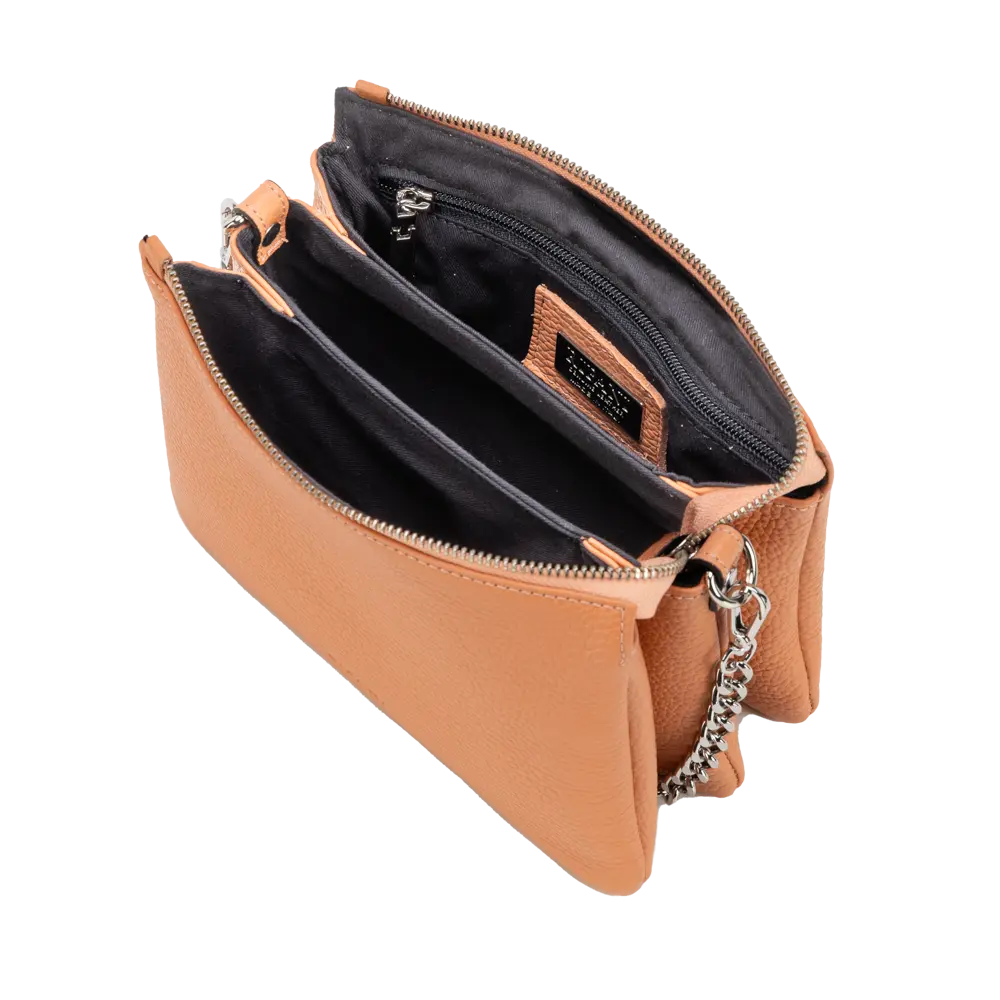 Triple compartment, zip closure, metal sleeve, adjustable shoulder strap, internal zip pocket, internal mobile phone holder
