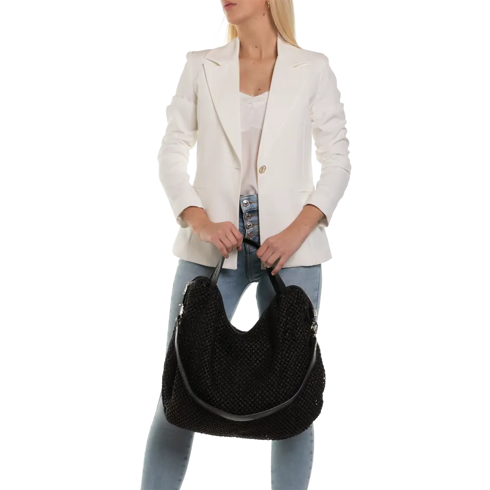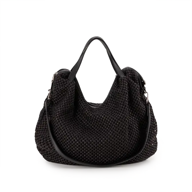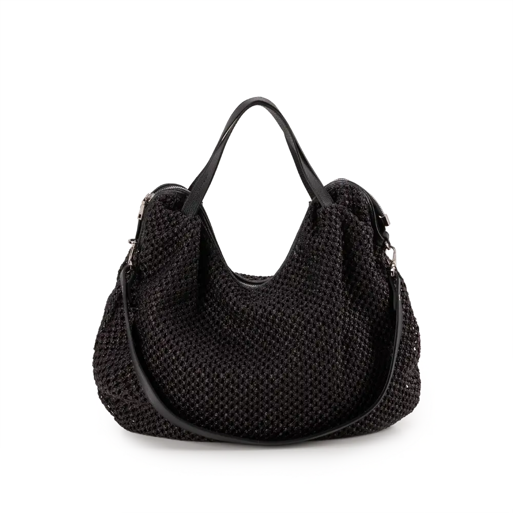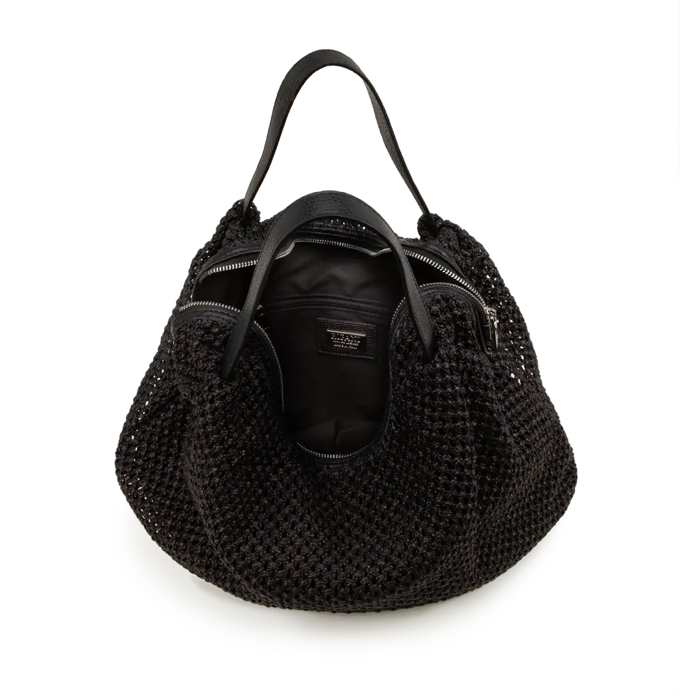 Super soft, wrap-around and roomy maxi bag in crochet straw with leather details , wearable over the shoulder or by hand.