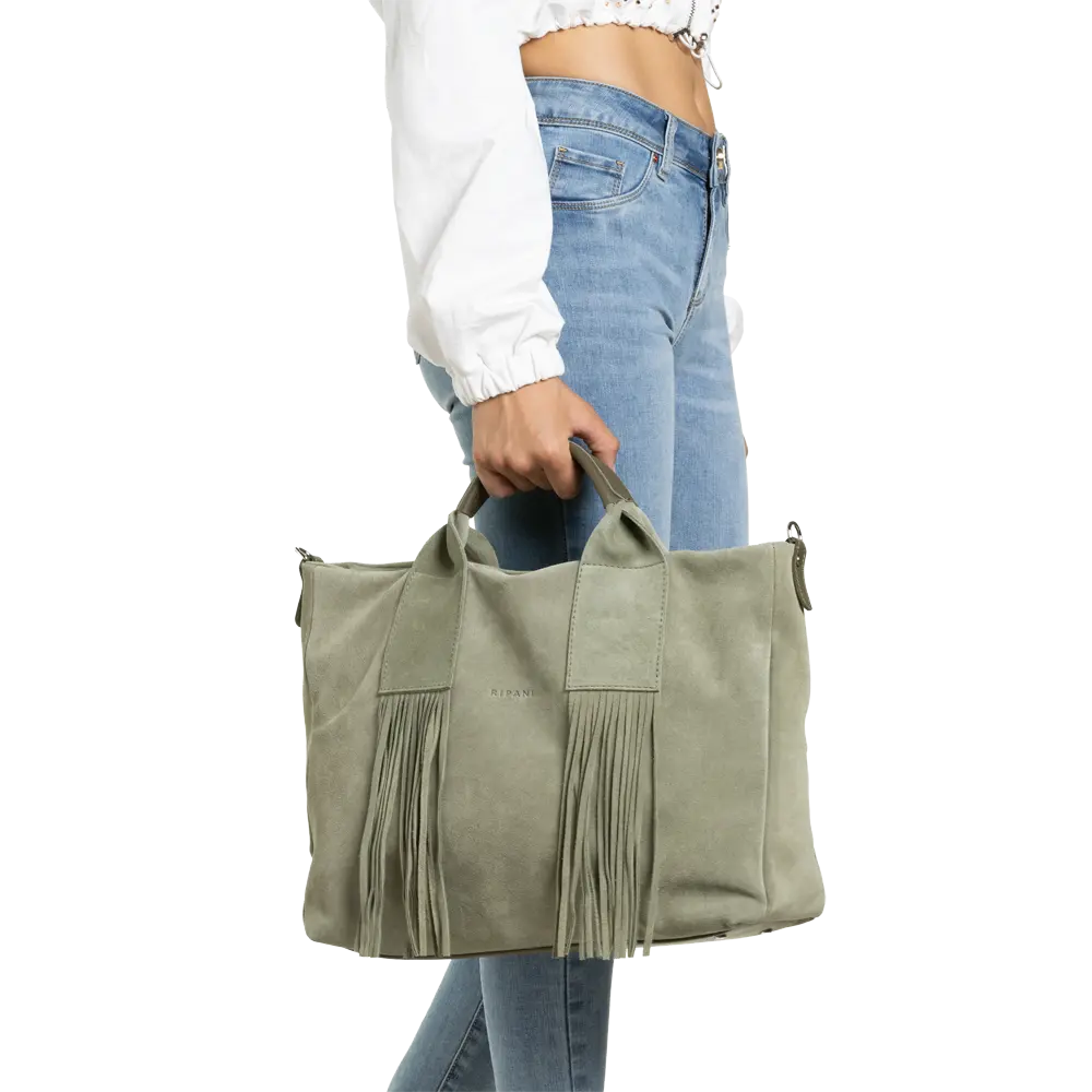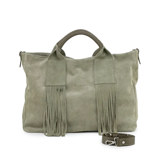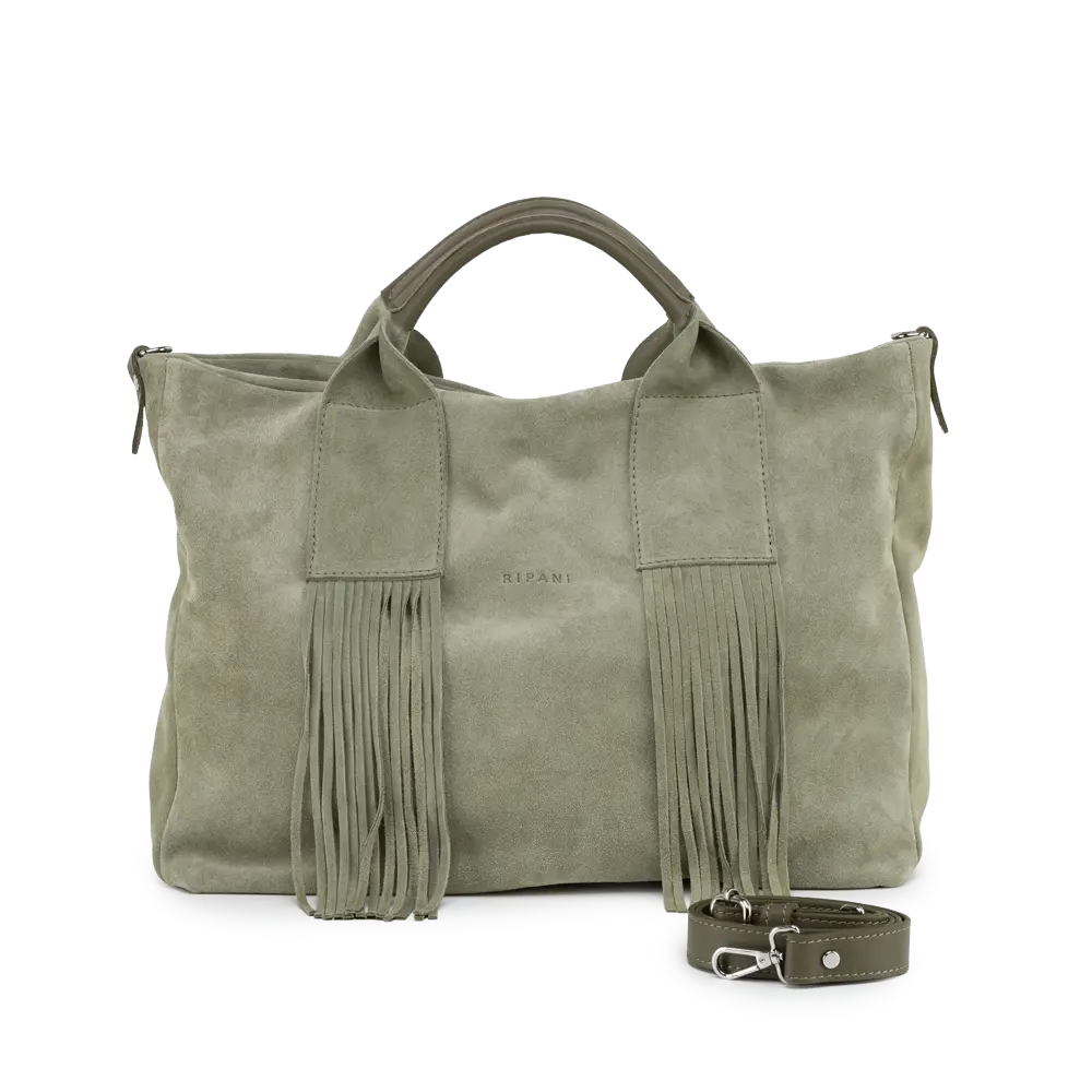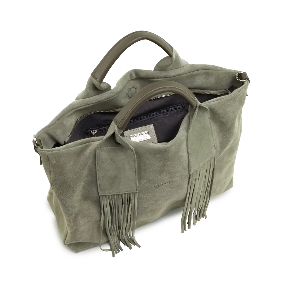Chiusura zip, Frange, Tracolla aggiuntiva regolabile, Taschino interno con zip, Portacellulare interno