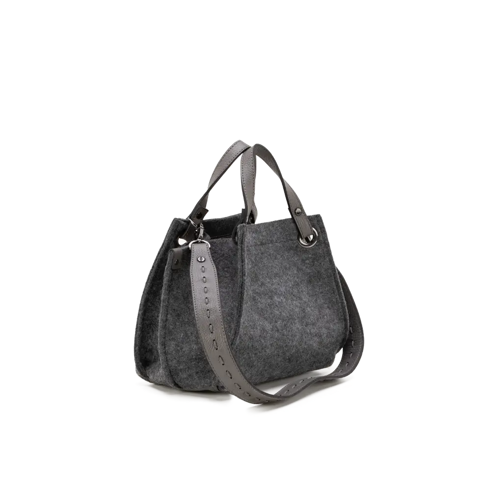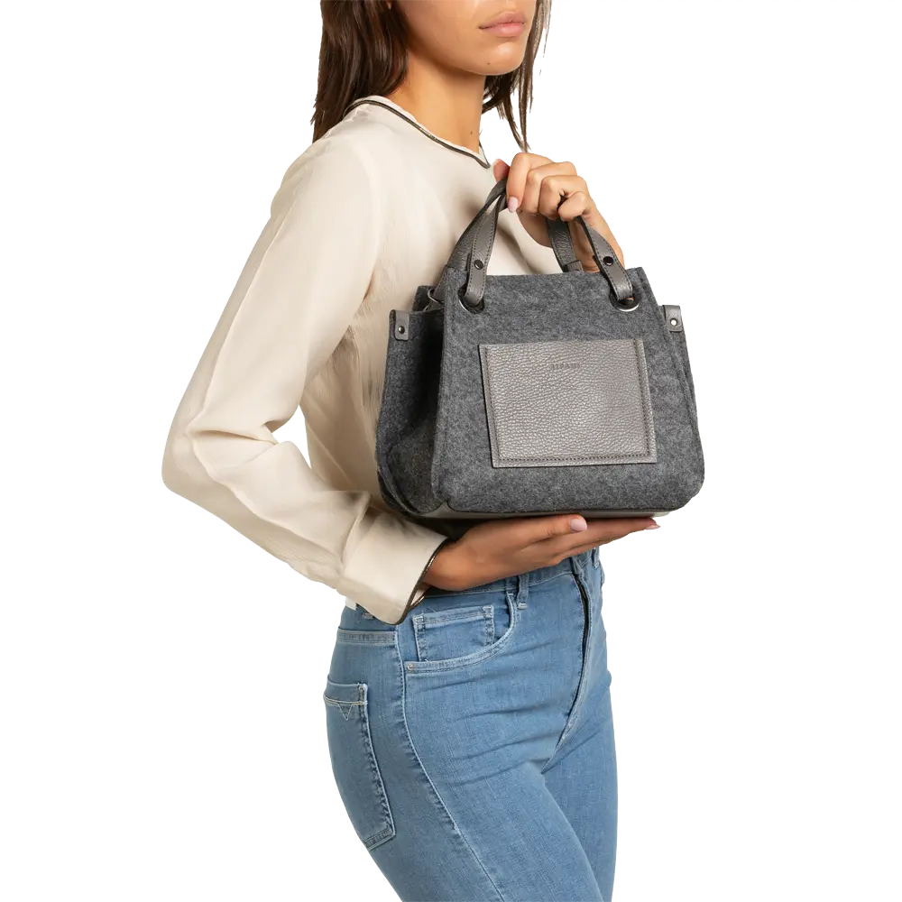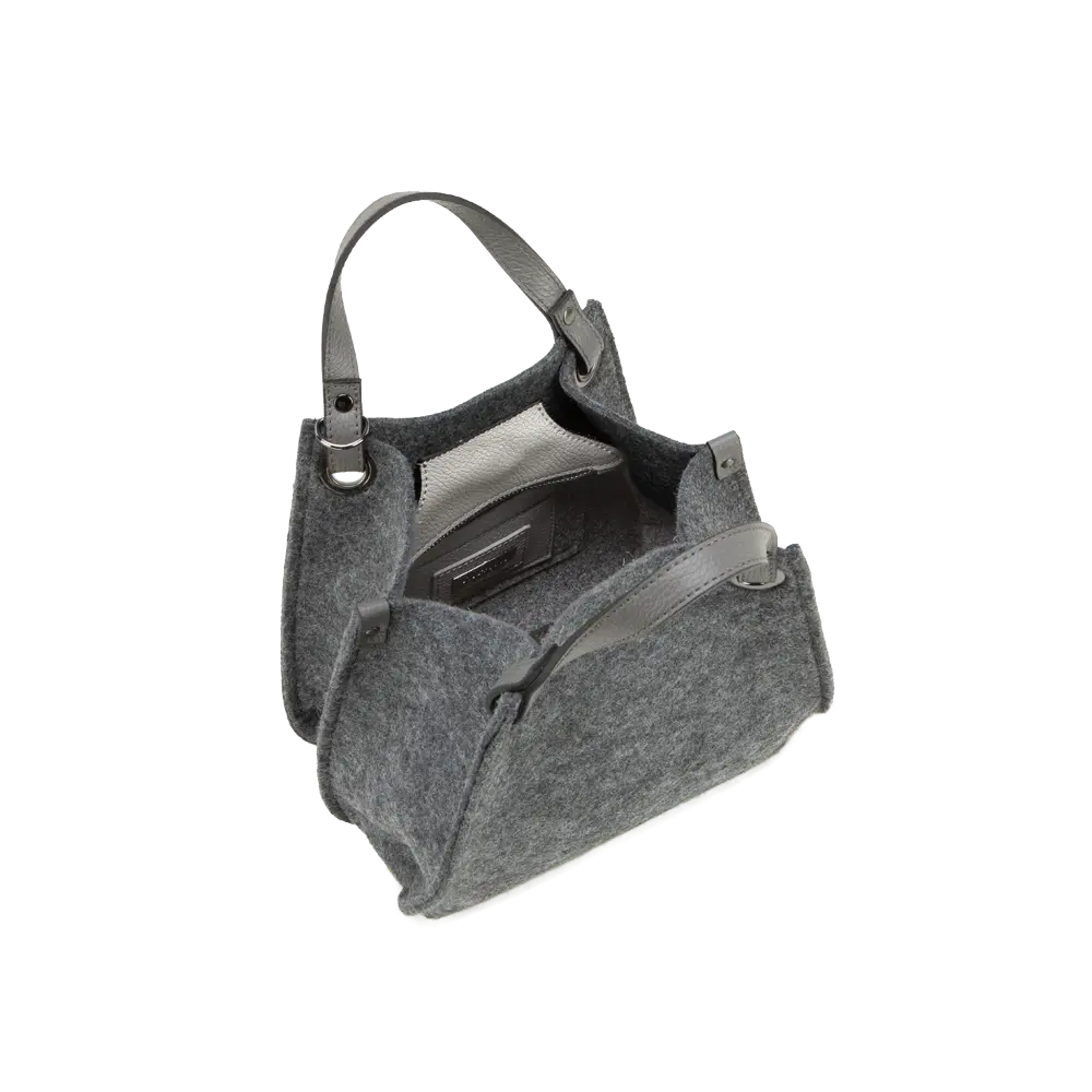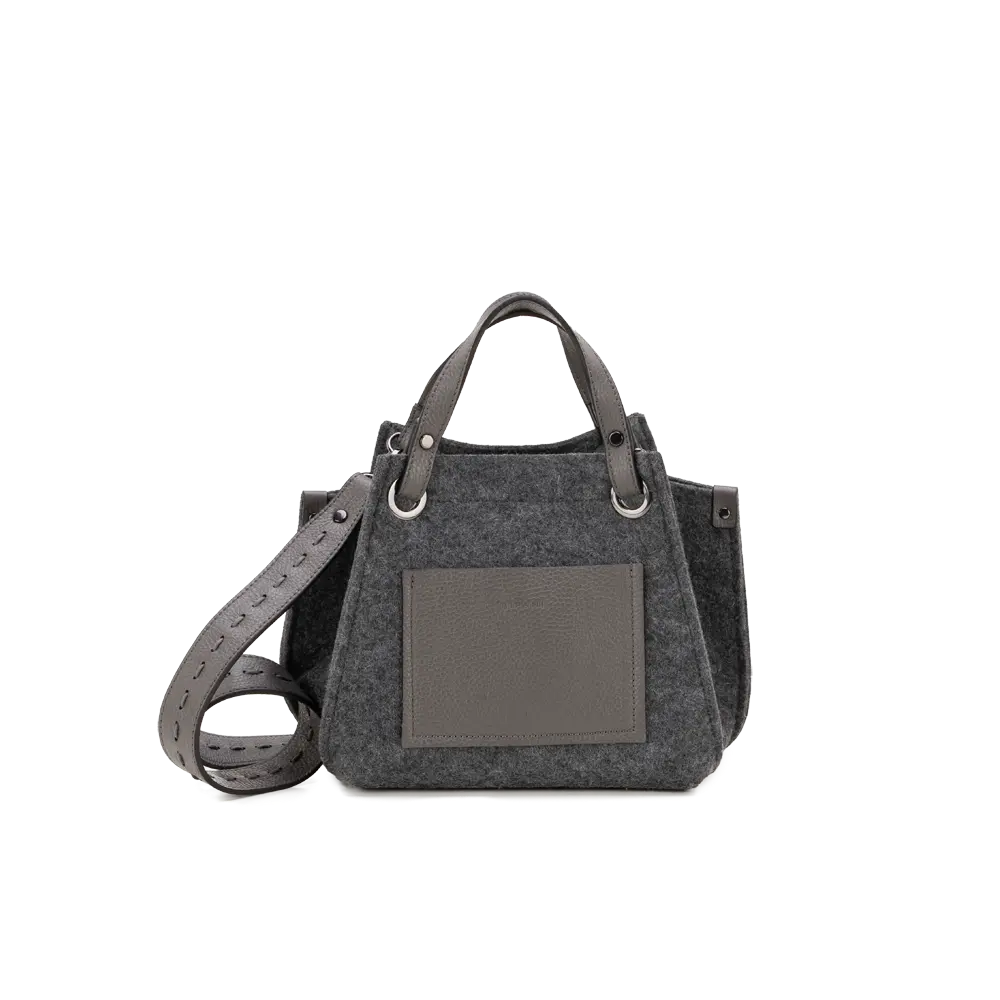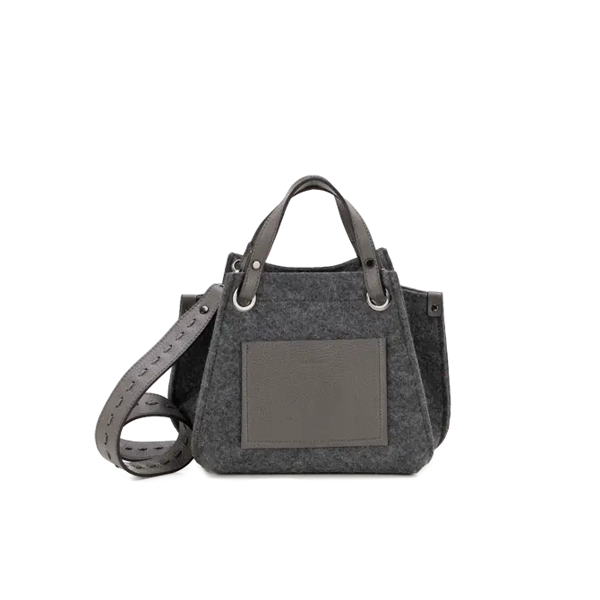 Airone è una borsa in vera pelle e feltro ottenuto da PET riciclato, completamente sfoderata. Il modello è corredato da una tracolla in pelle con infilatura a mano