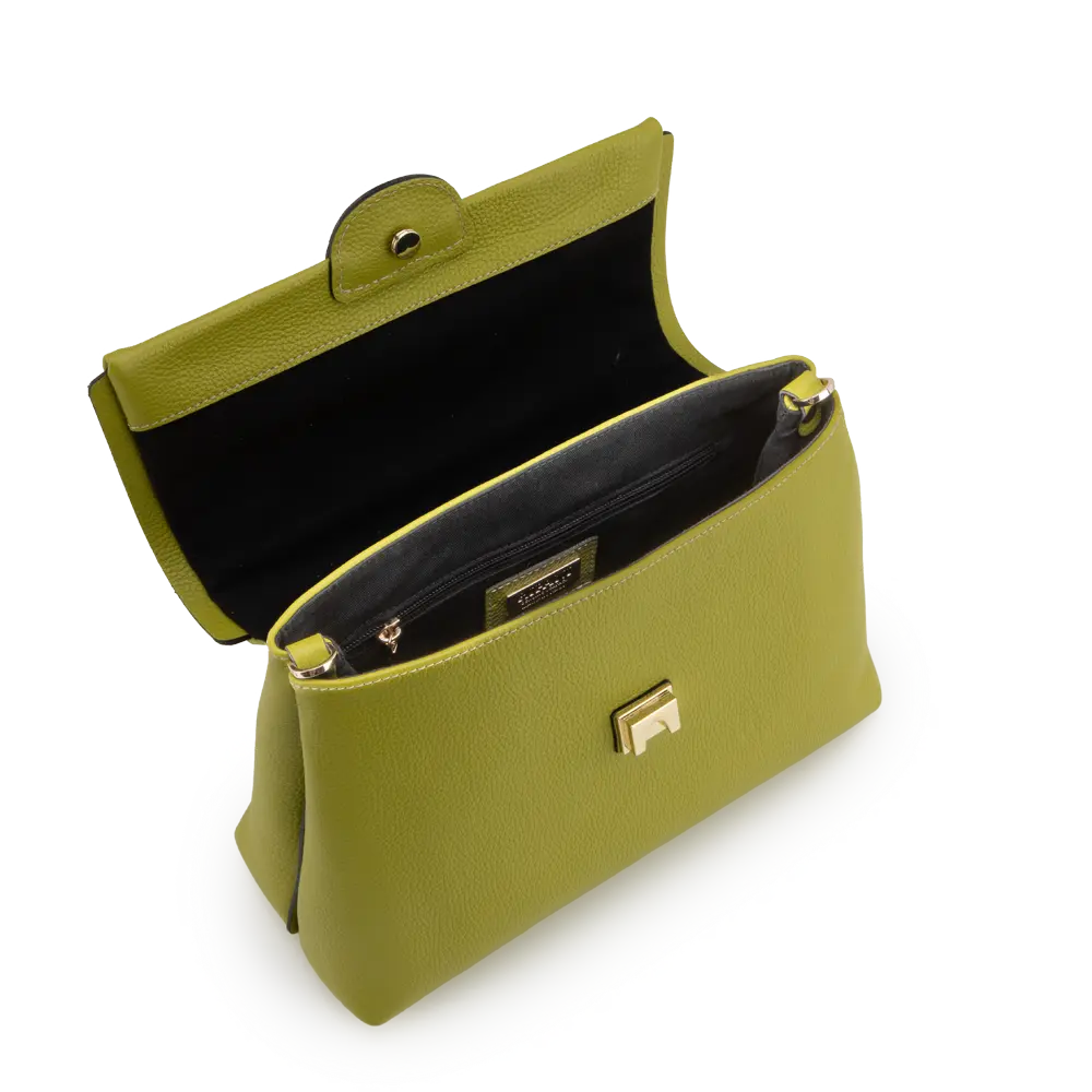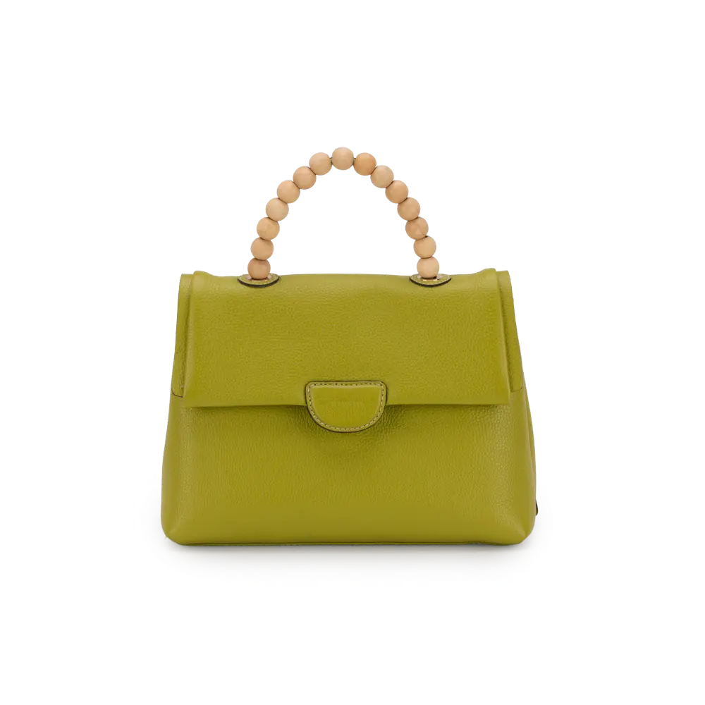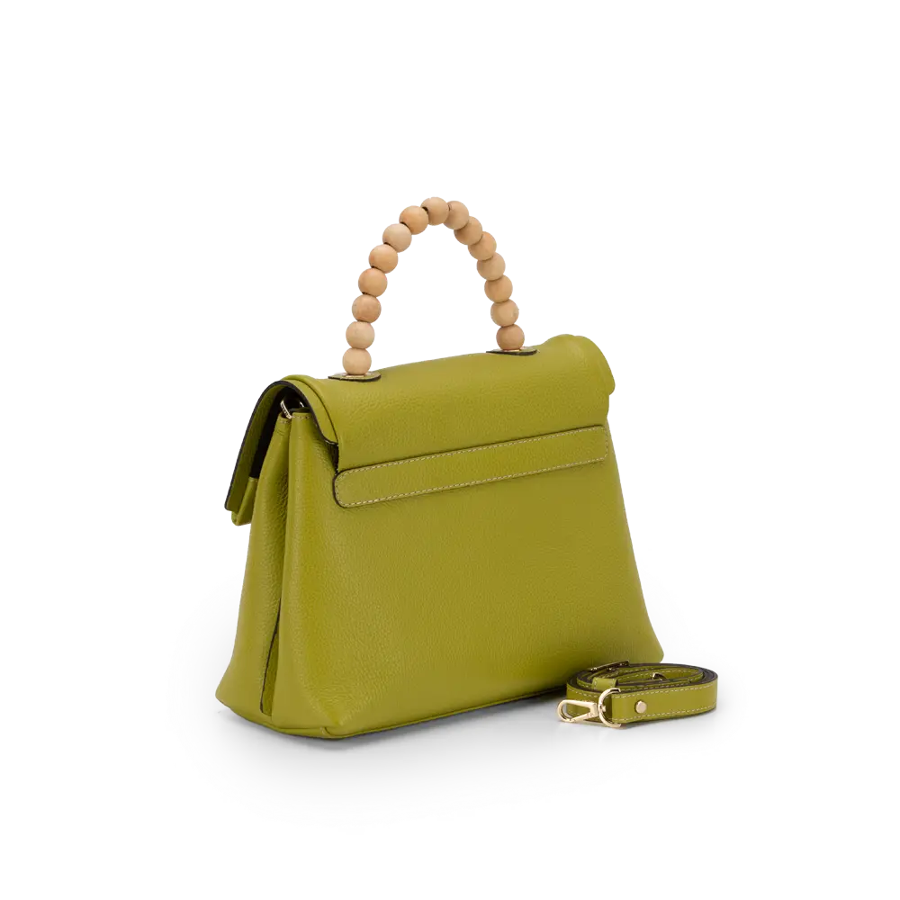 Manico in legno, Chiusura con patta push, Fodera interna in cotone, Tasca con zip e portacellulare, Tracolla aggiuntiva, Silhouette modificabile